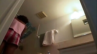 Not to be caught by spouse black MILF is fucked by son in the bathroom