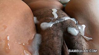 Girl with hairy pussy gets a big squirt on her face and black lollipop romps her hairy pussy and spunks
