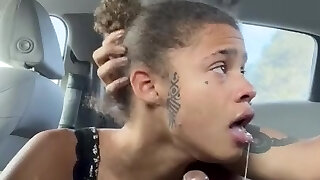 Ebony deepthroats long ebony cock at the backseat and guzzles cum