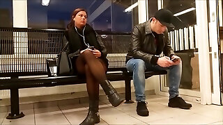 Stinky black pantyhose feet in senior school bus foot wors